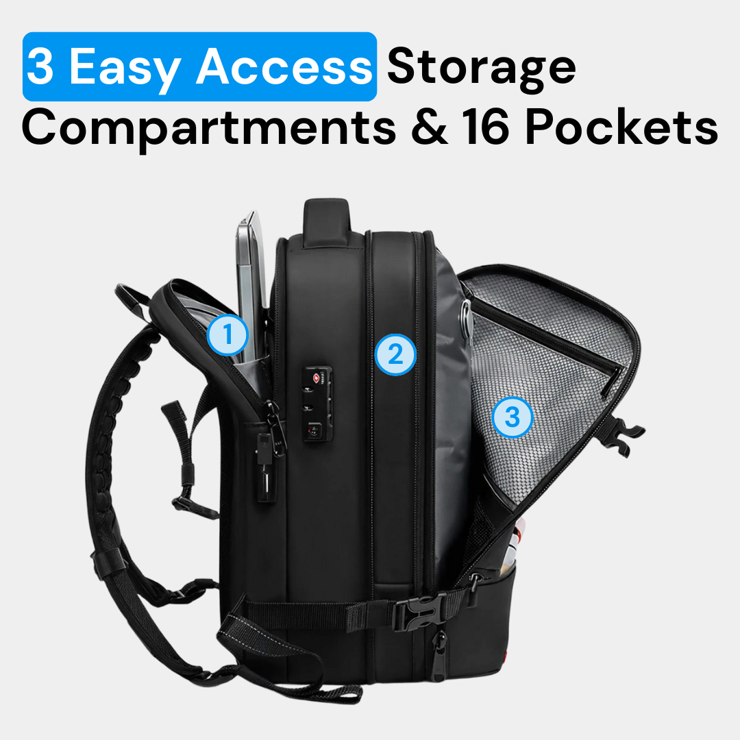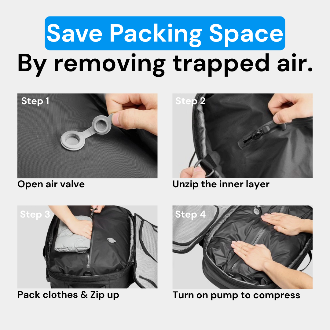 Eliminate excess air from your bag using our integrated compression technology and unlock 50% additional capacity, letting you fit all your essentials and beyond.